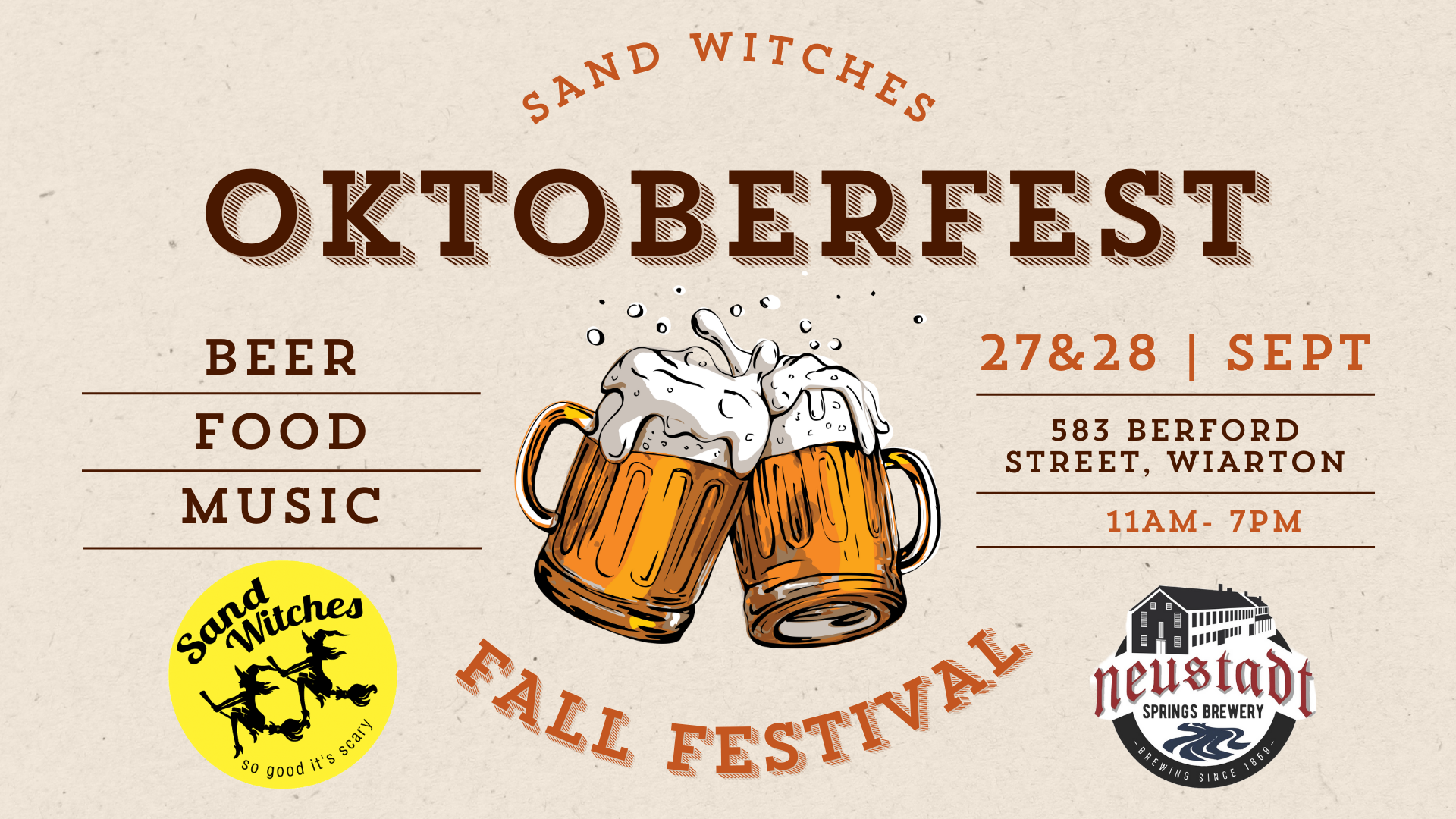 The Sand Witches team are bringing Oktoberfest to downtown Wiarton on Friday September 27th and Saturday October 28th. This outdoor event, taking place between 11am and 7pm, will provide German food and drink lovers with have plenty to sample, with no cover charge for entry! With all the lively spirit of a traditional German festival, the Sand Witches will be cooking up Oktoberfest sausages with sauerkraut, cabbage rolls, pretzels with beer cheese, pork and turkey schnitzel options as well as sweet treats like apple strudel. And of course, what’s an Oktoberfest without a beer tent? Enjoy a selection of authentic German beers served up in style (oh yes there will be traditional attire too!), locally made by Neustadt Springs as you sit outside sipping and soaking up the fall weather.
