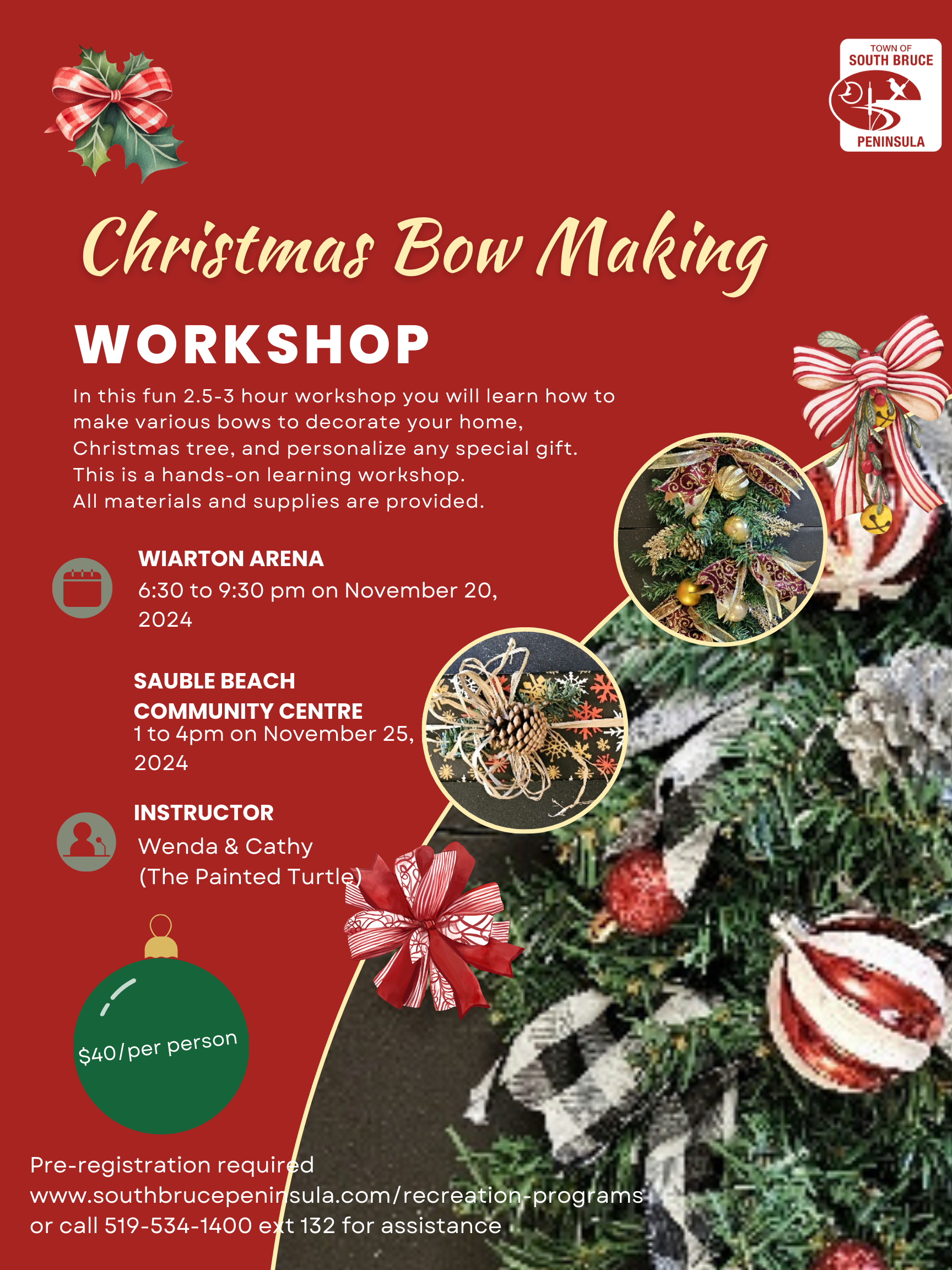 In this 2.5 to 3 hour workshop you will learn how to make various bows to decorate your home, Christmas tree, and personalize any special gift.