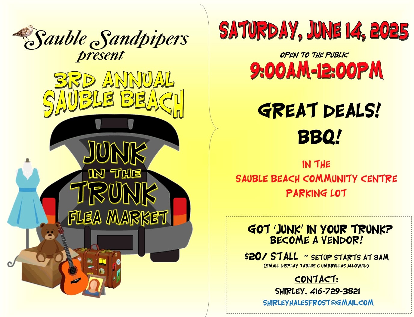 The Sauble Sandpipers are excited to present the 3rd Annual Sauble Beach Junk in the Trunk Flea Market. Come out for the Great deals and delicious BBQ