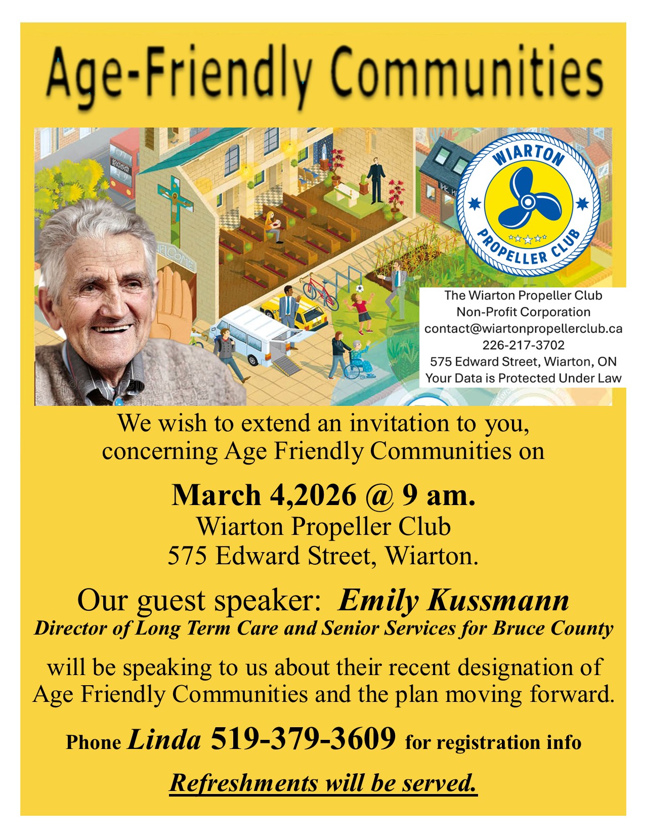 Emily Kussmann will speak about the recent designation of an Age-Friendly Community. Registration is required. Call Linda at 519-379-3609.