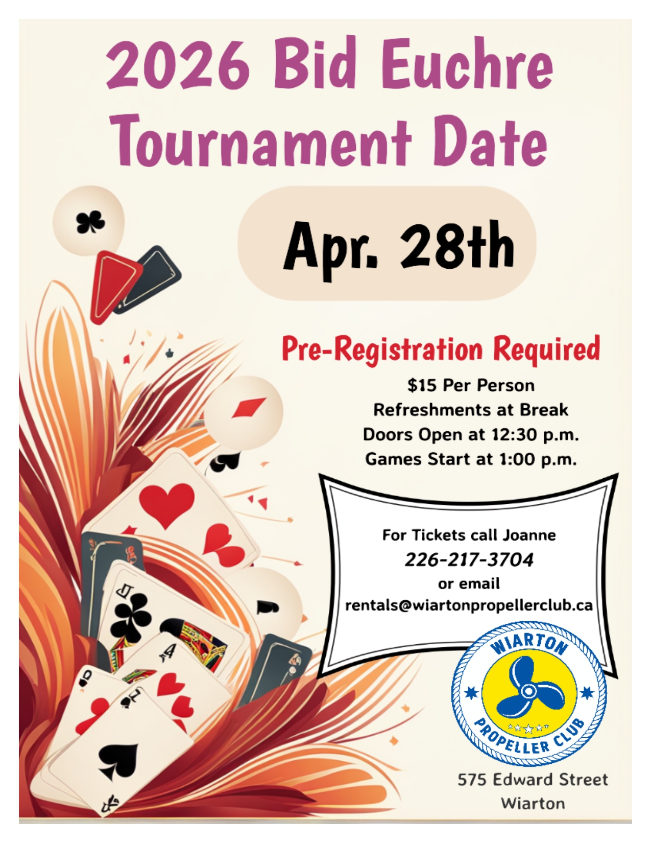 Tickets call Joanne at 226-217-3704 or email rentals@wiartonpropellerclub.ca
